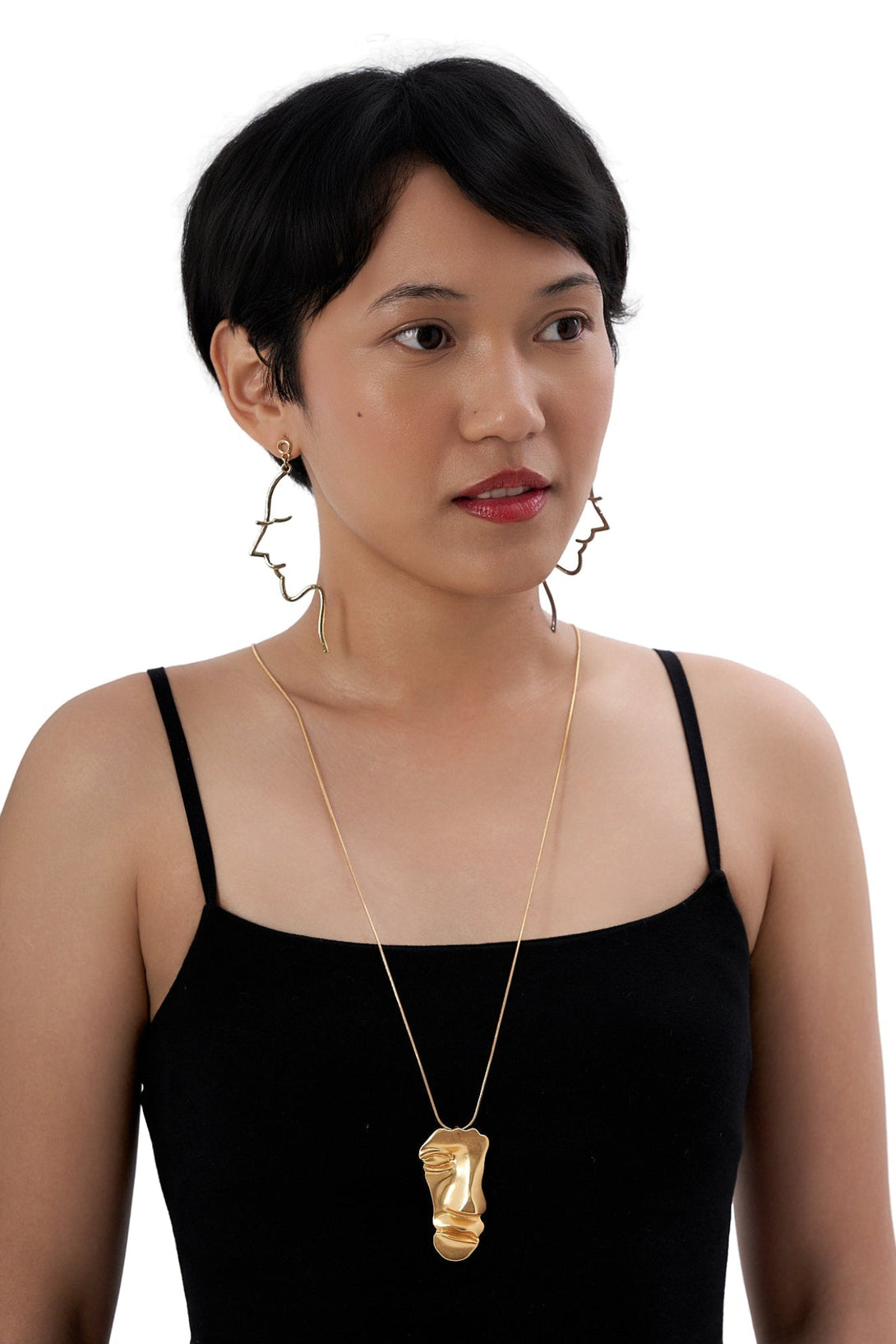 - Bold and sculptural gold-tone necklace featuring an abstract face pendant with fluid, organic contours