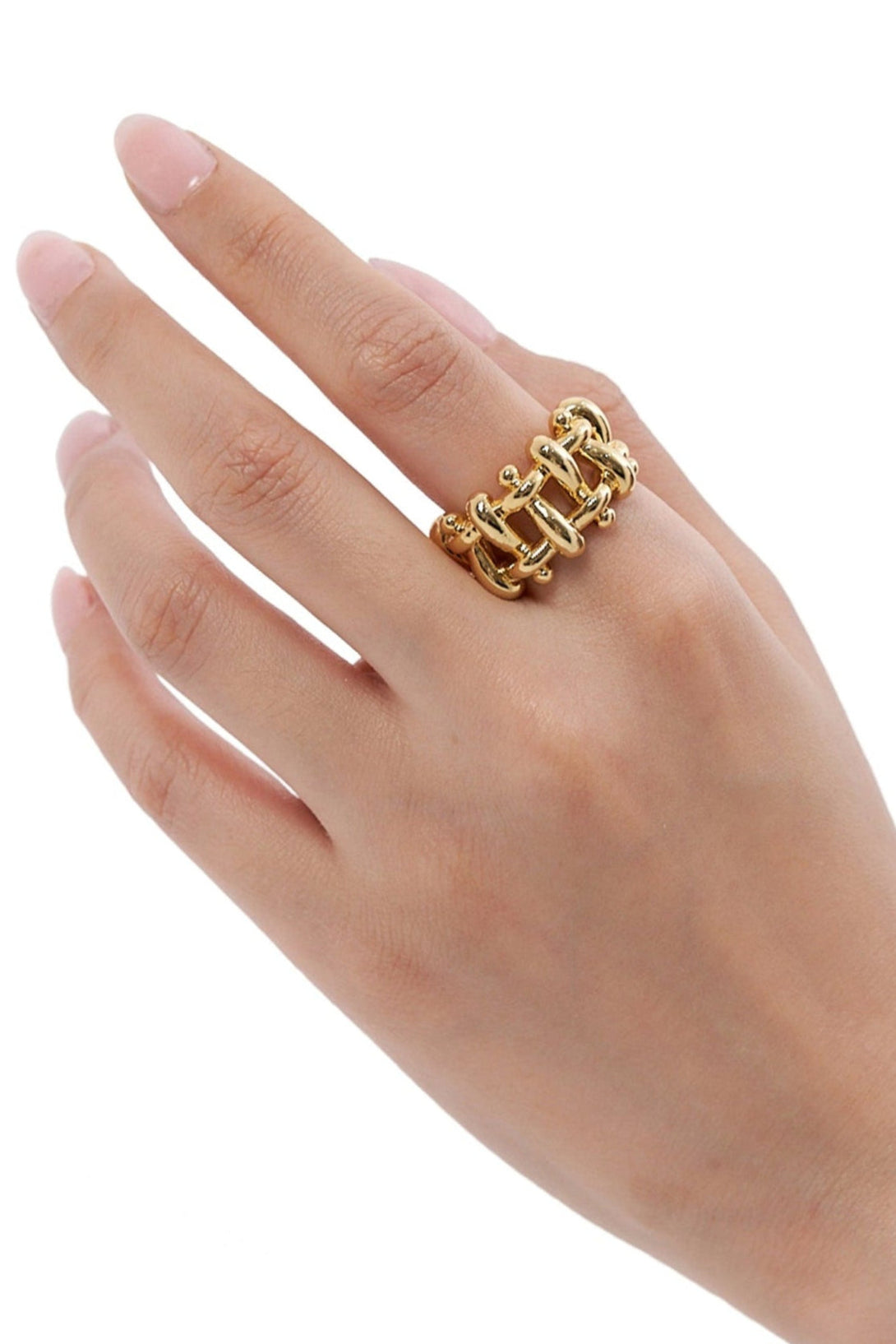 - Bold statement ring with a chunky, linked design