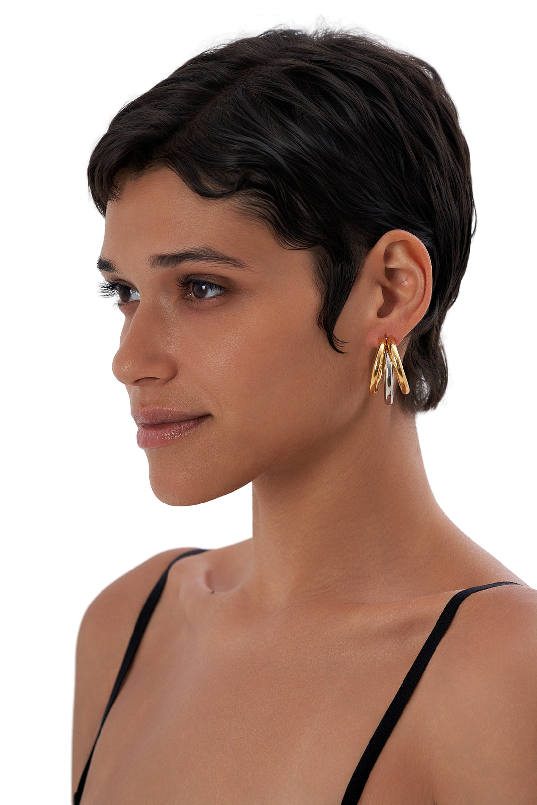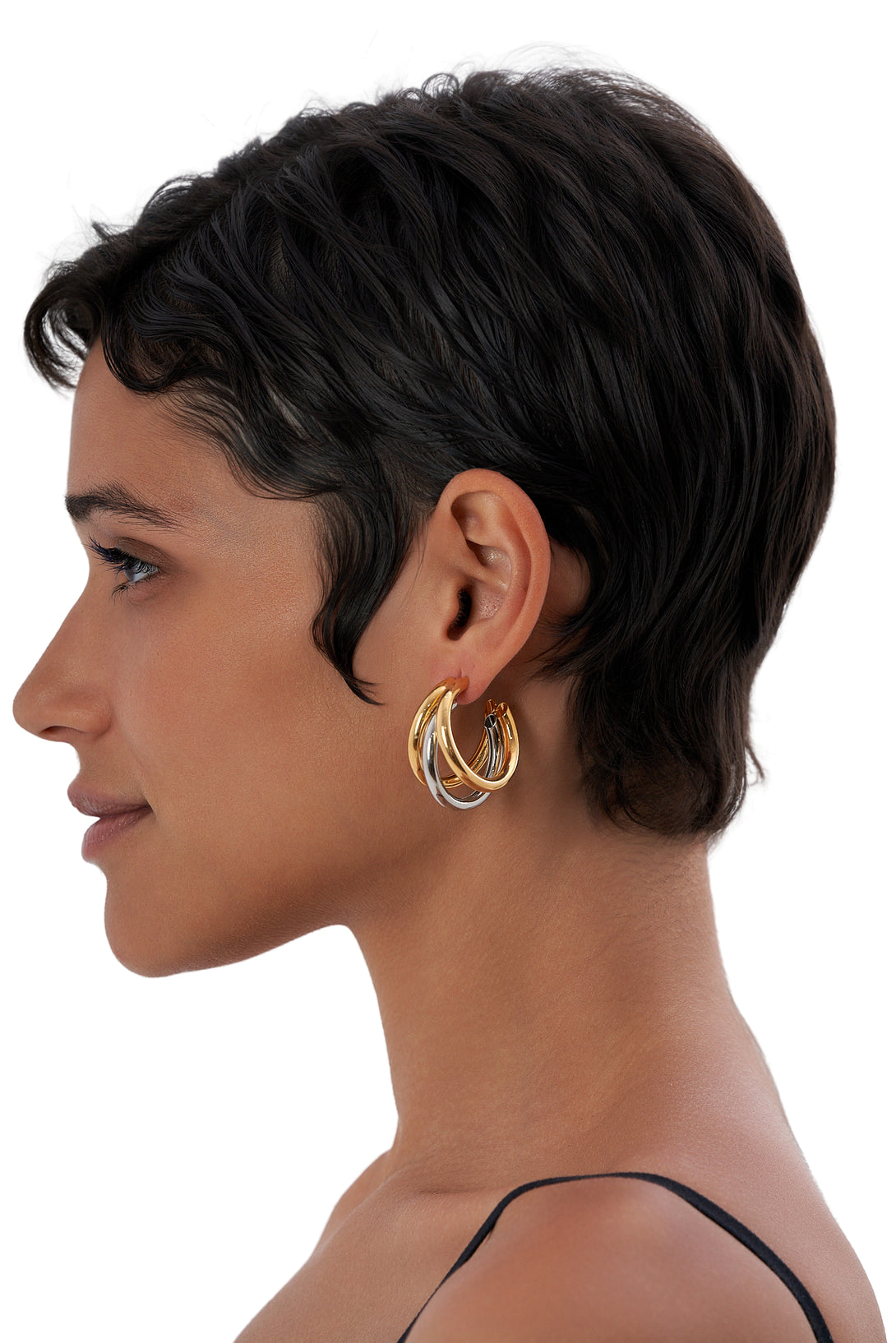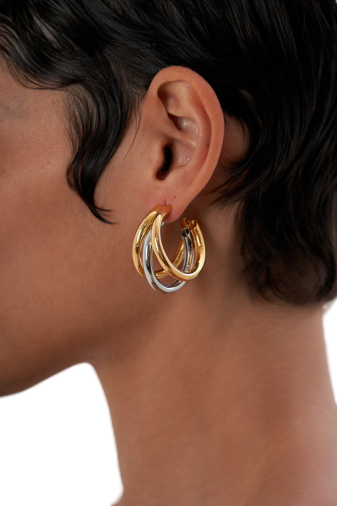 - Chunky interlocking hoops in mixed metallic tones—gold and silver for double the shine