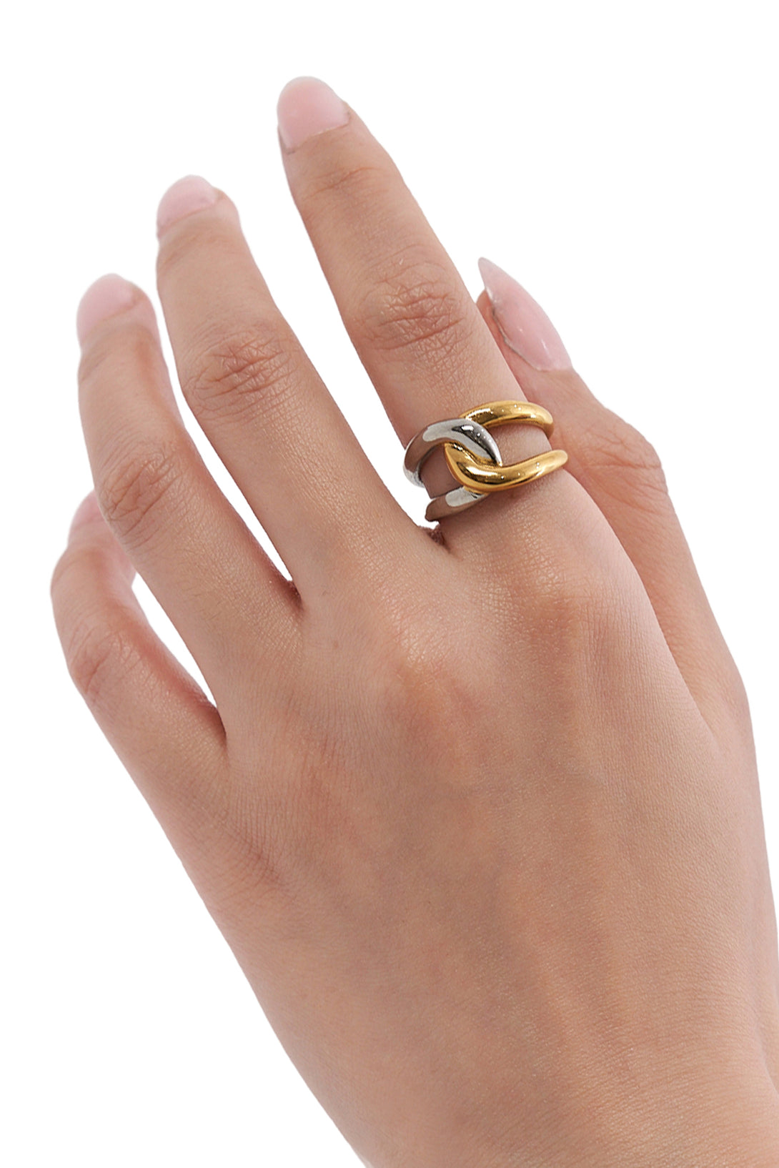 - Bold and sculptural, this stainless steel ring features an interlocked loop design in mixed metallic tones — silver and gold — symbolizing unity and duality