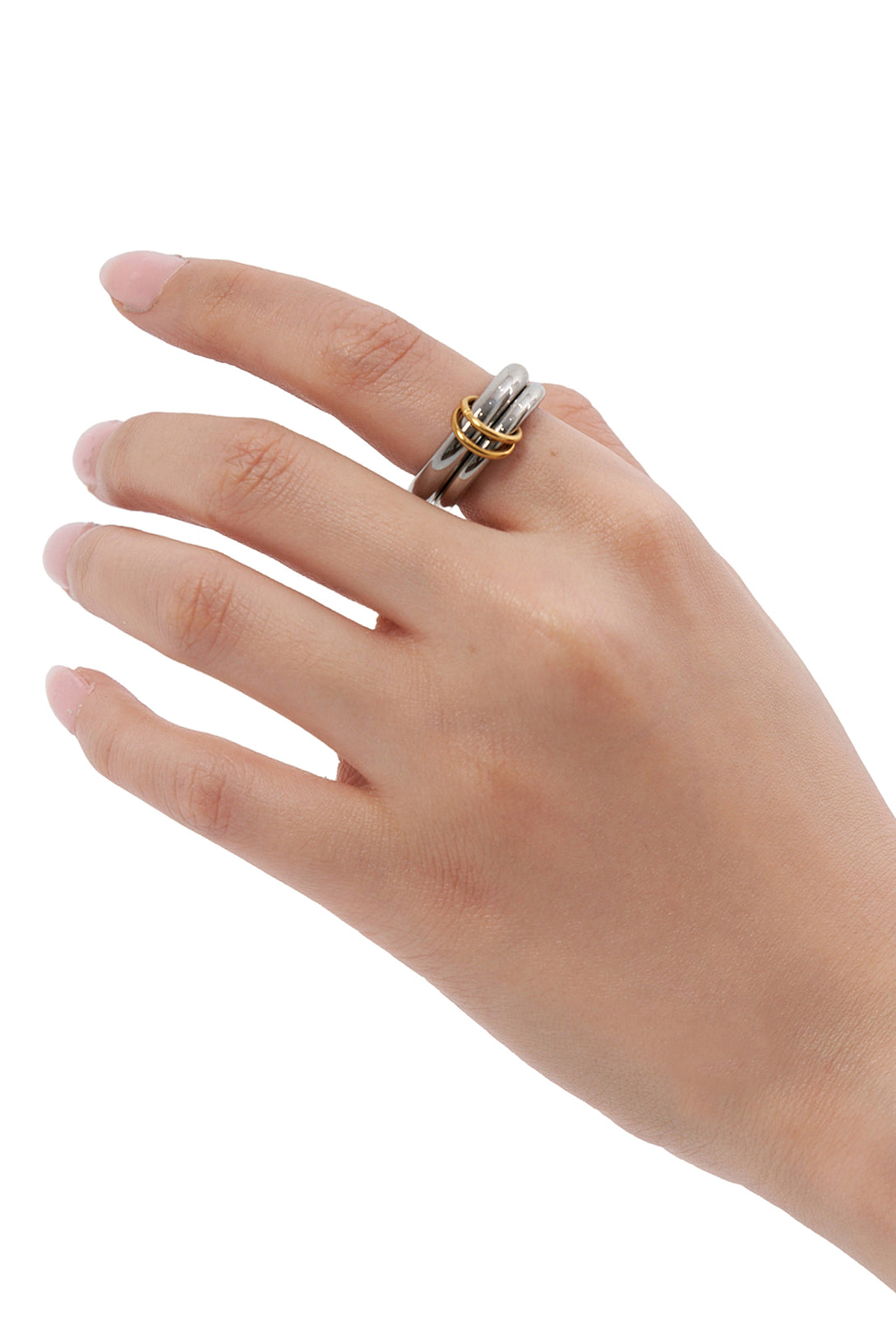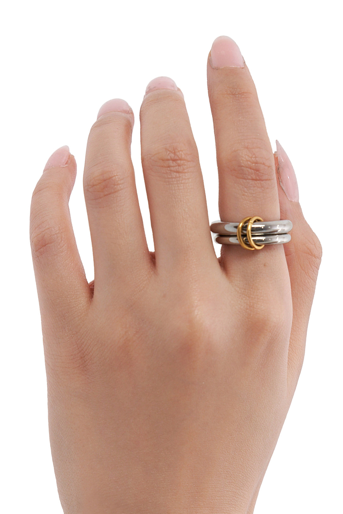 - A striking two-tone design featuring interlocking silver and gold-plated loops that create a sculptural, layered effect