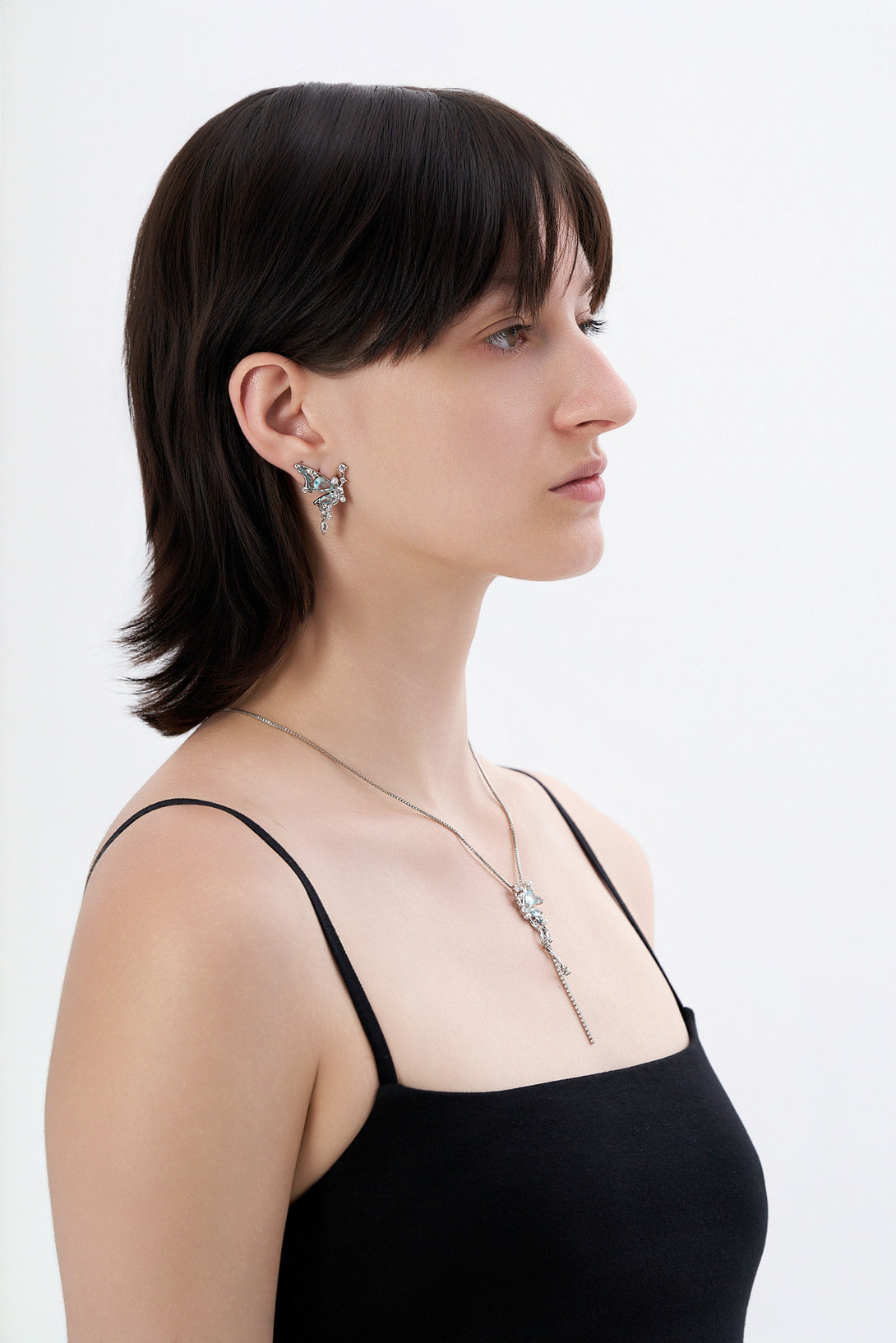 - One side features a statement drop with a delicate crystal strand, while the other offers a shorter, sculptural silhouette for visual balance