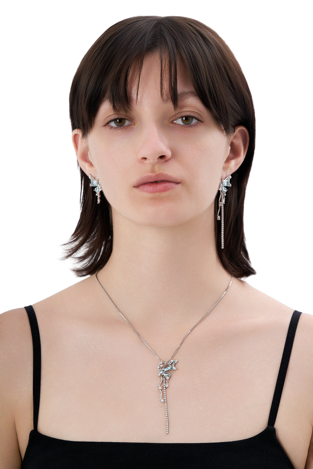 - Silver-plated lariat necklace featuring a butterfly-inspired pendant detailed with sparkling crystal stones