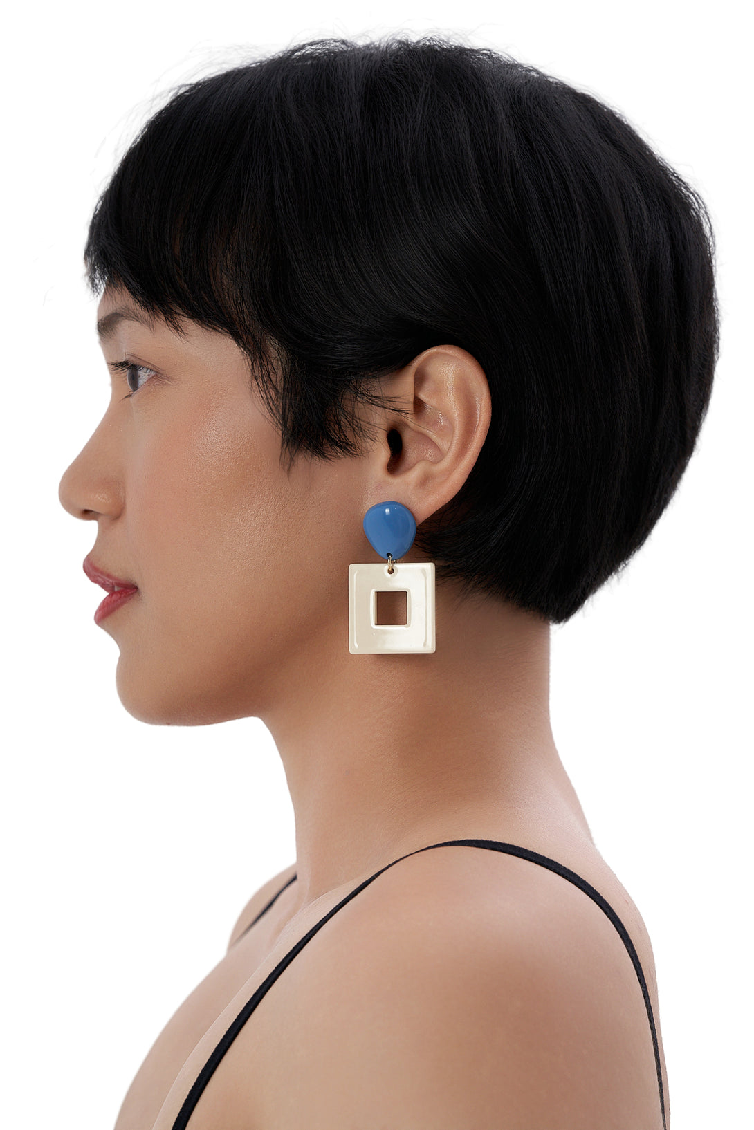 - Bold statement drop earrings featuring a glossy, teardrop-shaped blue stud paired with a cream-toned square frame pendant