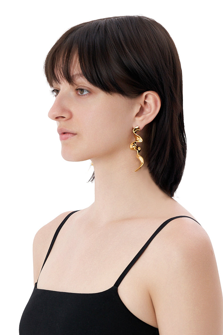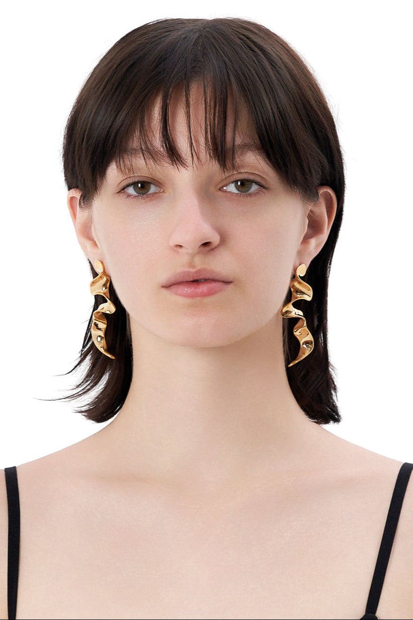 - Sculptural, wave-like statement earrings that channel a bold, modern art aesthetic