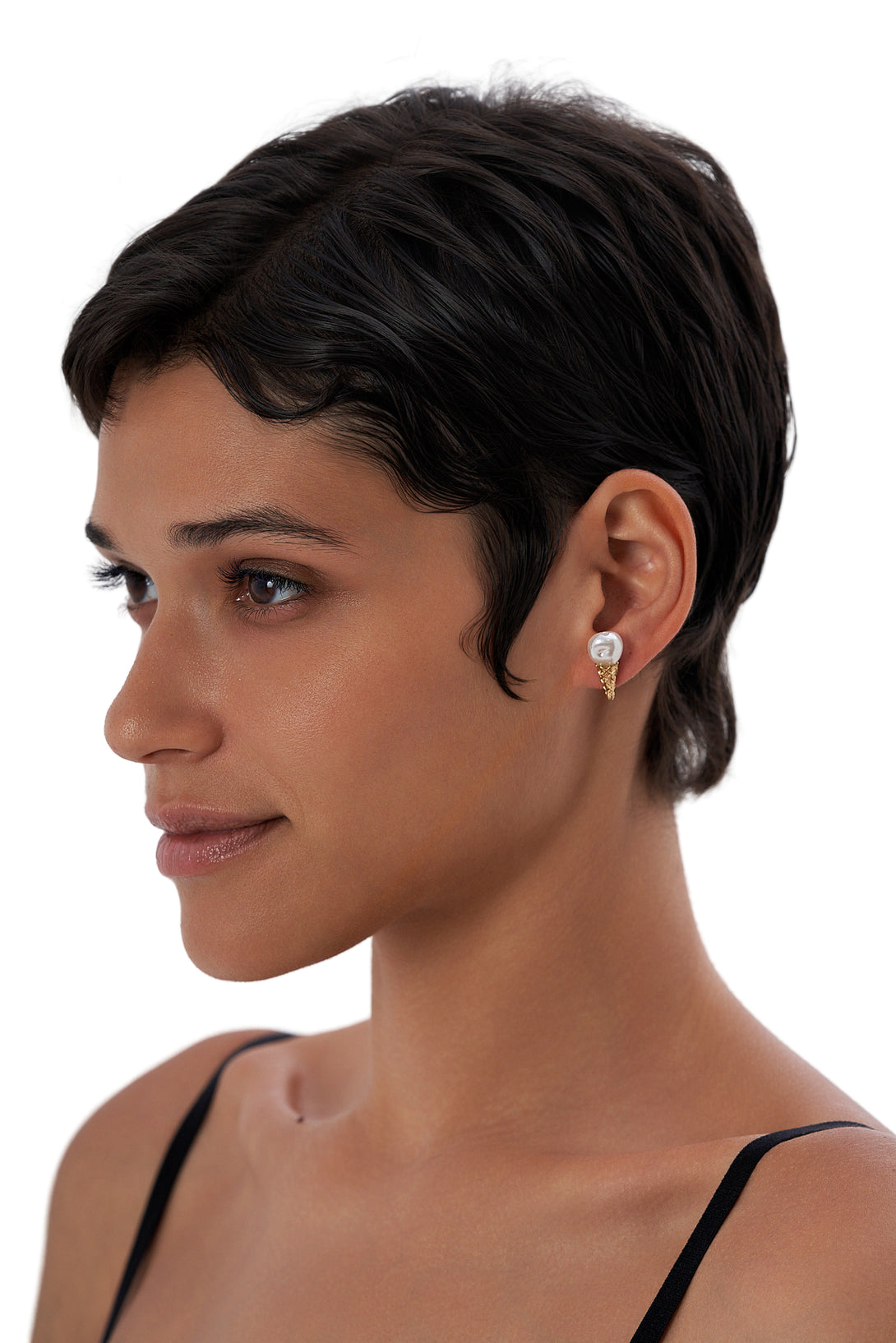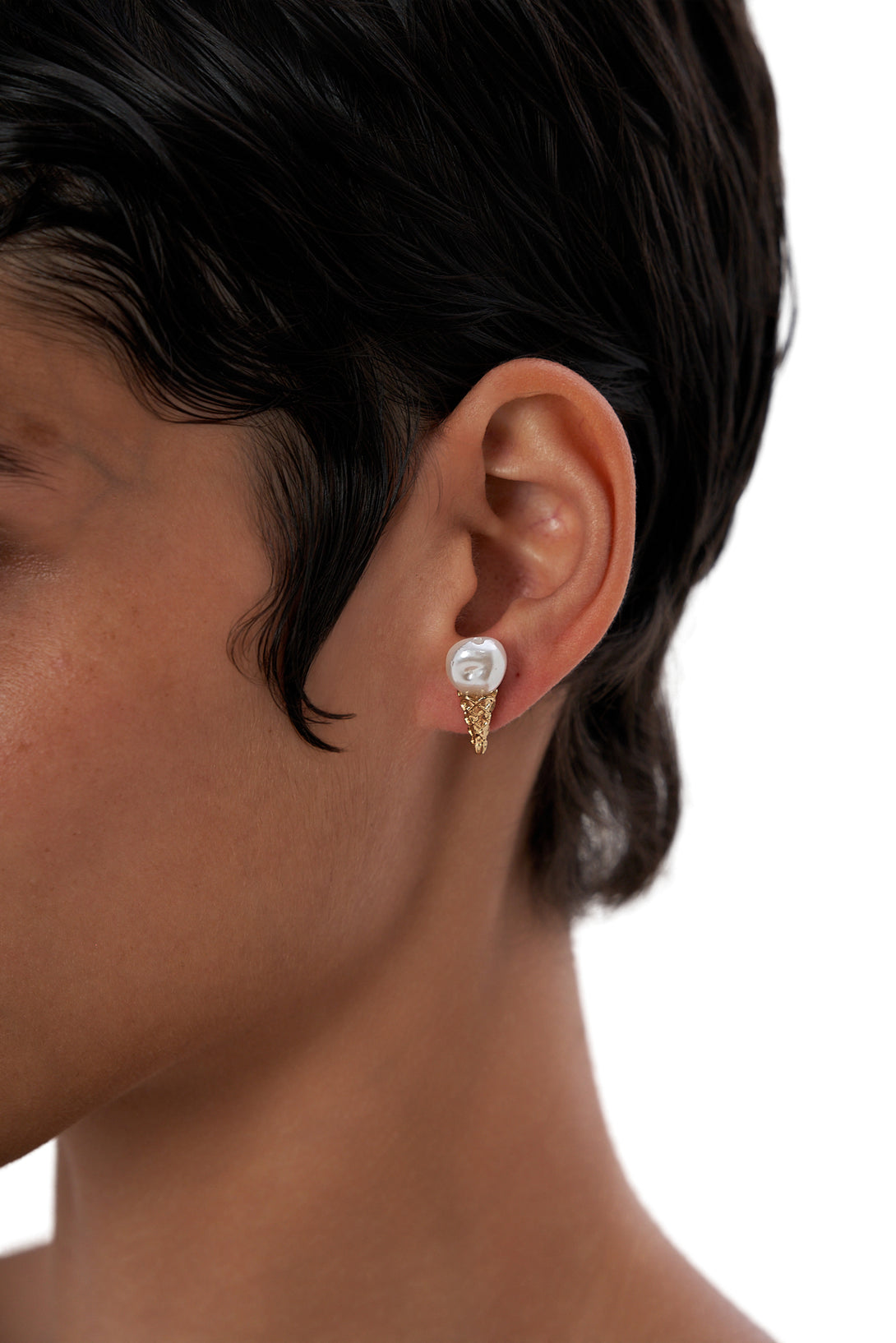 - Features a swirled real pearl scoop with a gold-tone textured cone