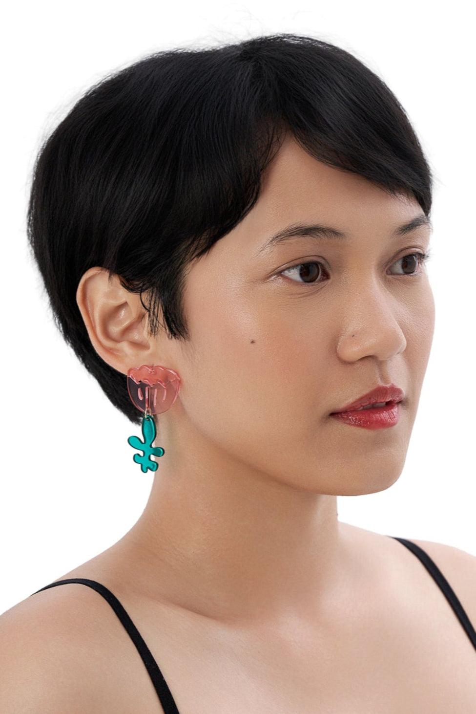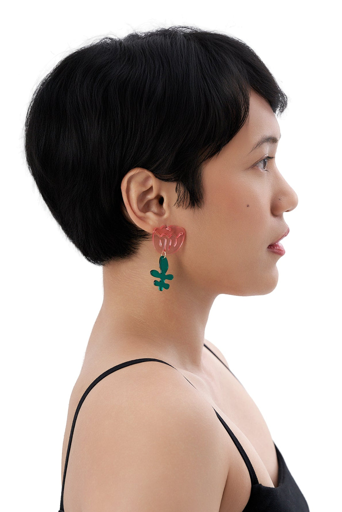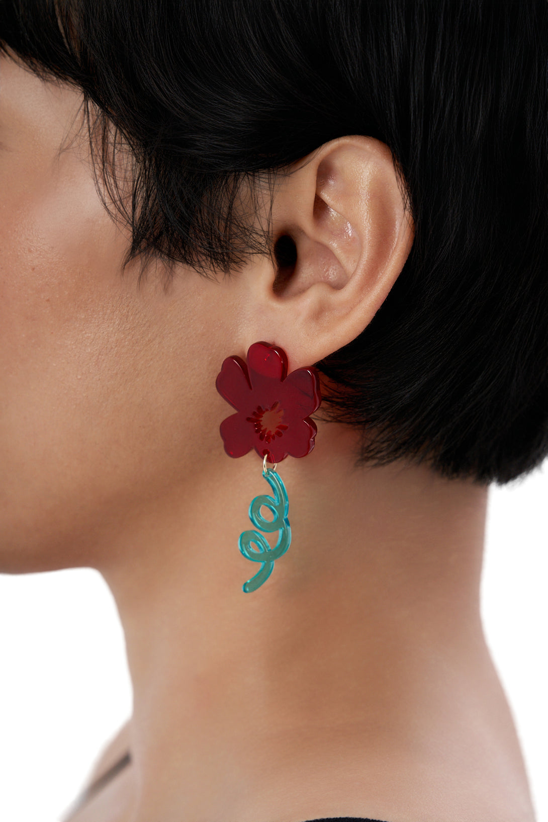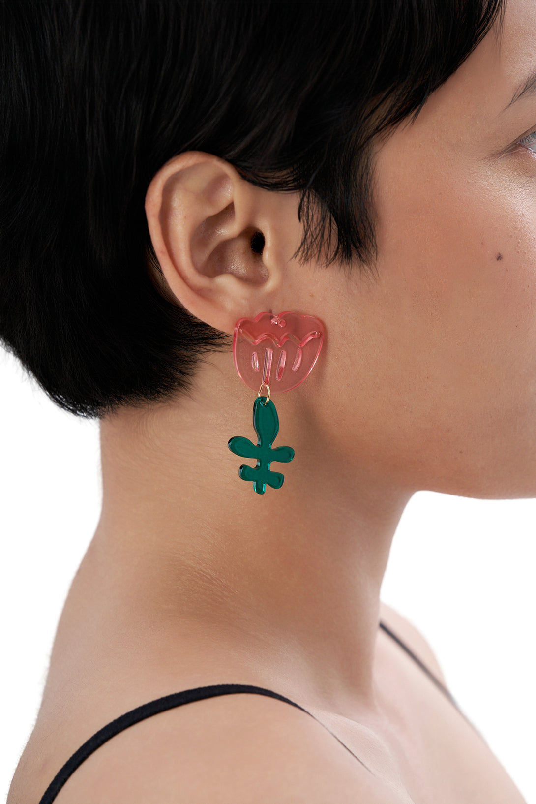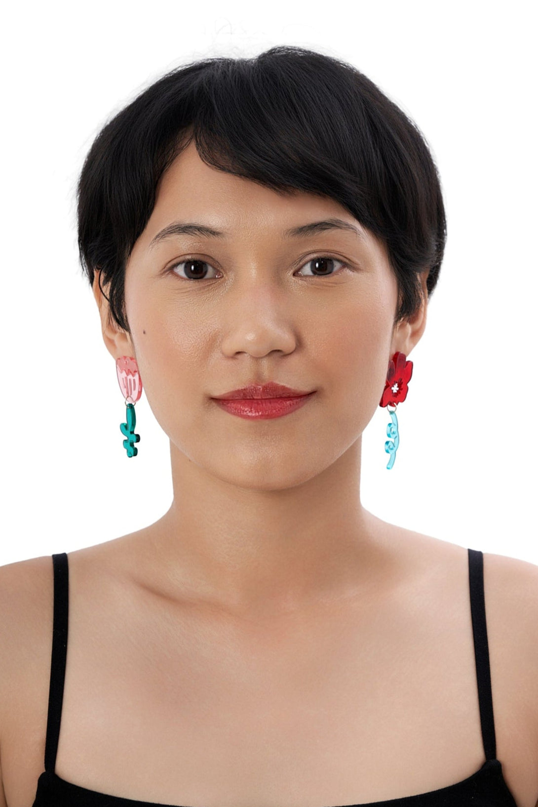 - One earring features a cherry-red blossom with a swirly aqua vine; the other, a pink tulip paired with an emerald-green abstract leaf