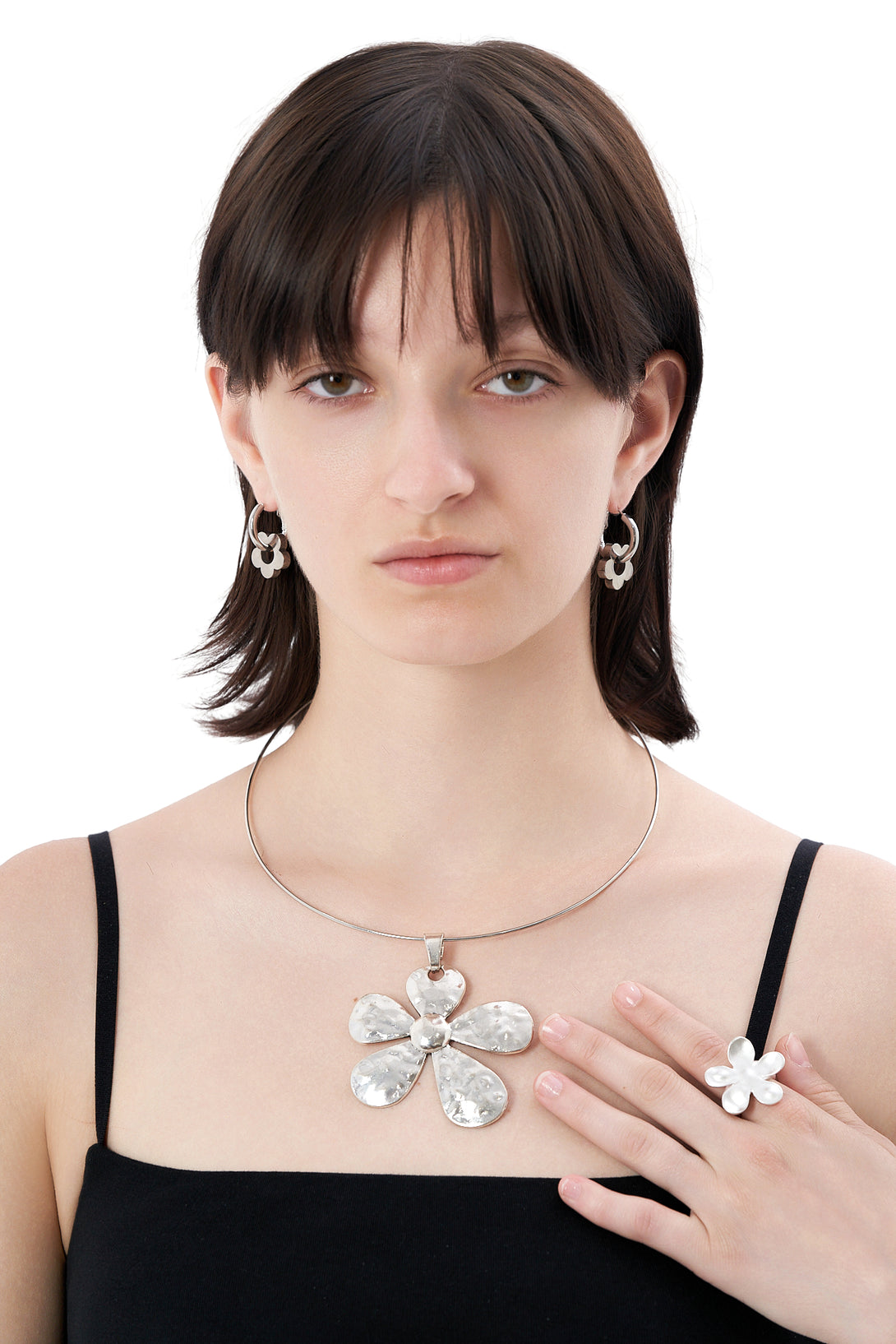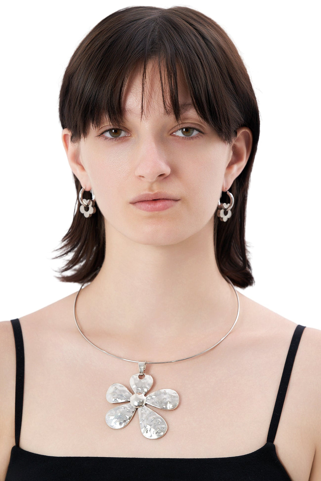 - Statement necklace featuring a large hammered flower pendant on a sleek silver choker band