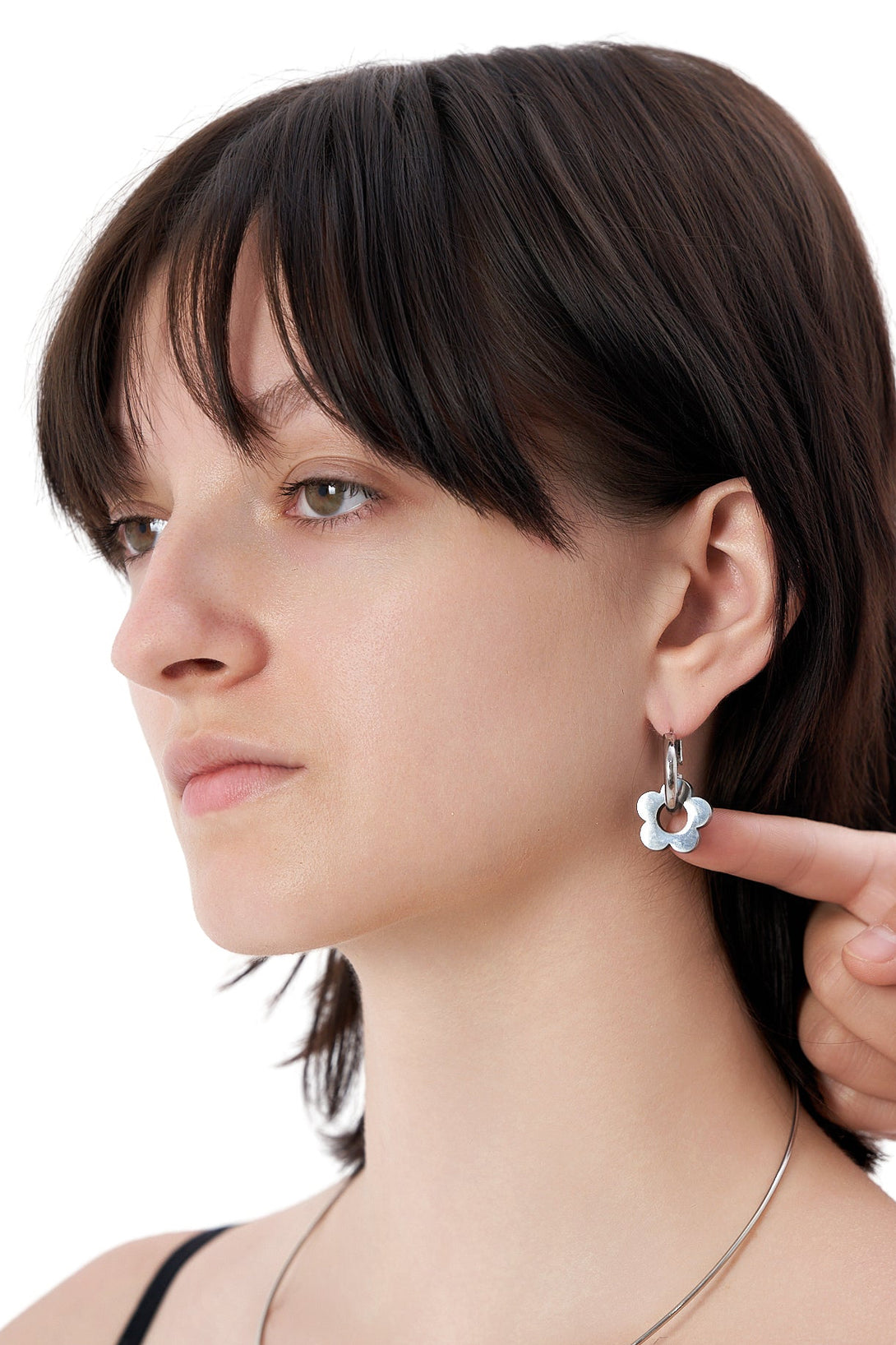 - Silver-plated hoop earrings featuring mini hammered flower charms with organic petal texture