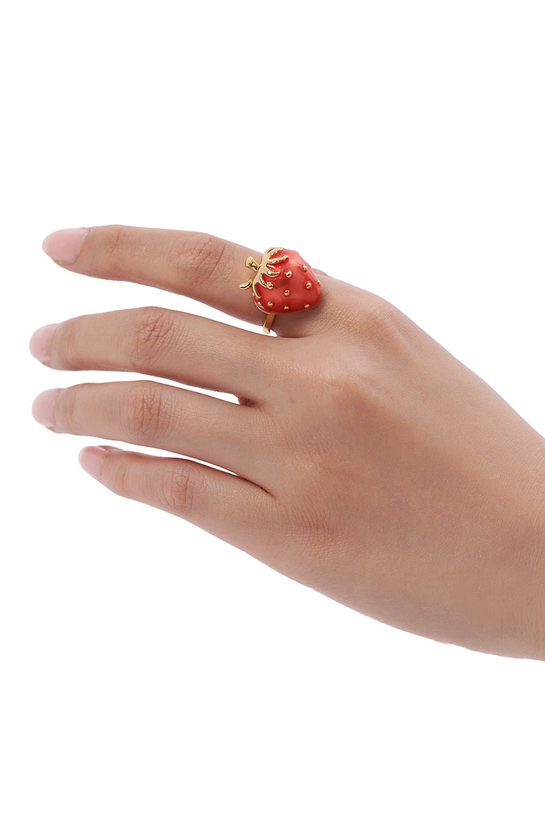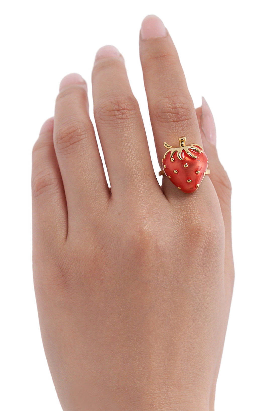 - Playful 18k gold-plated strawberry ring with glossy red enamel and golden leaf details