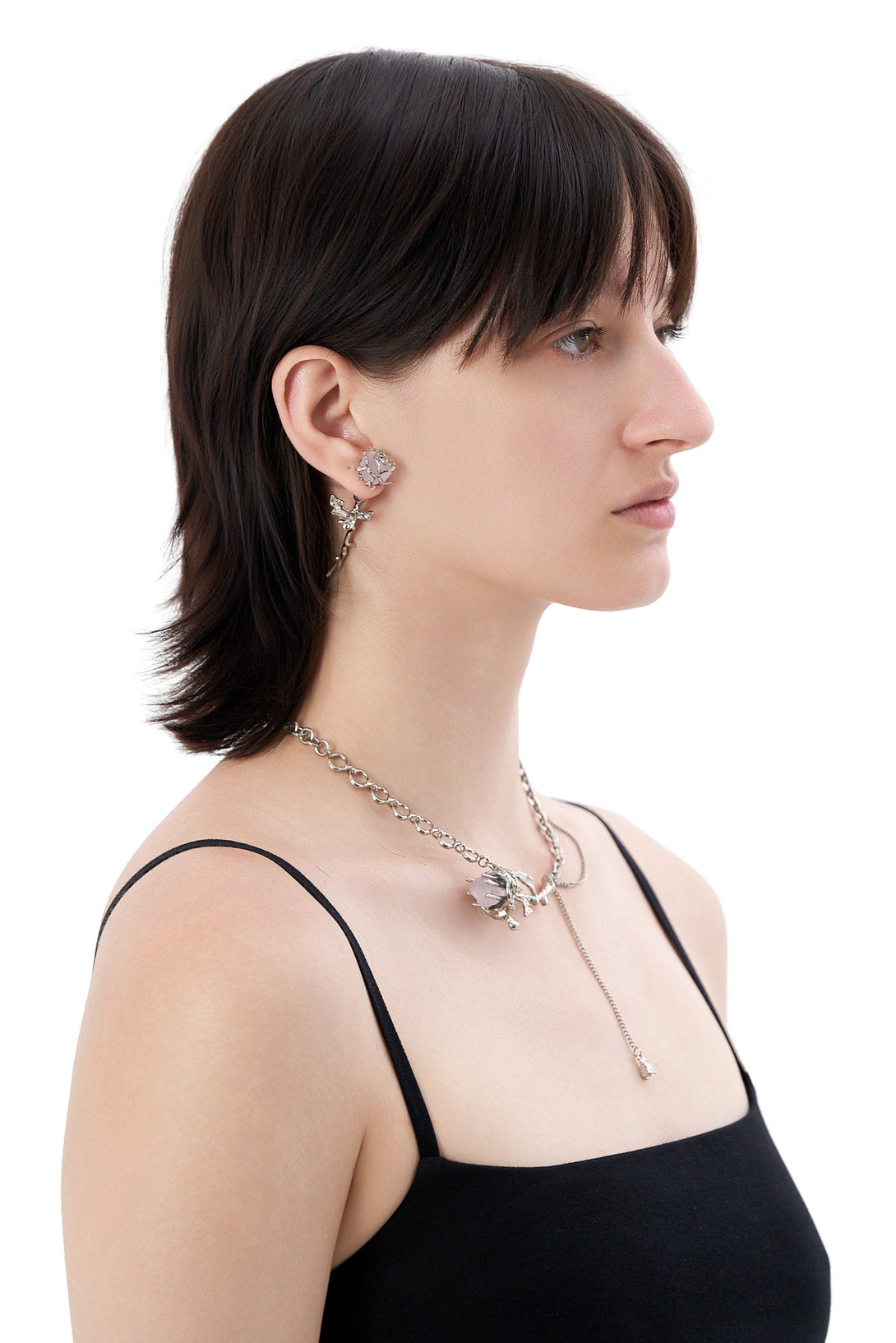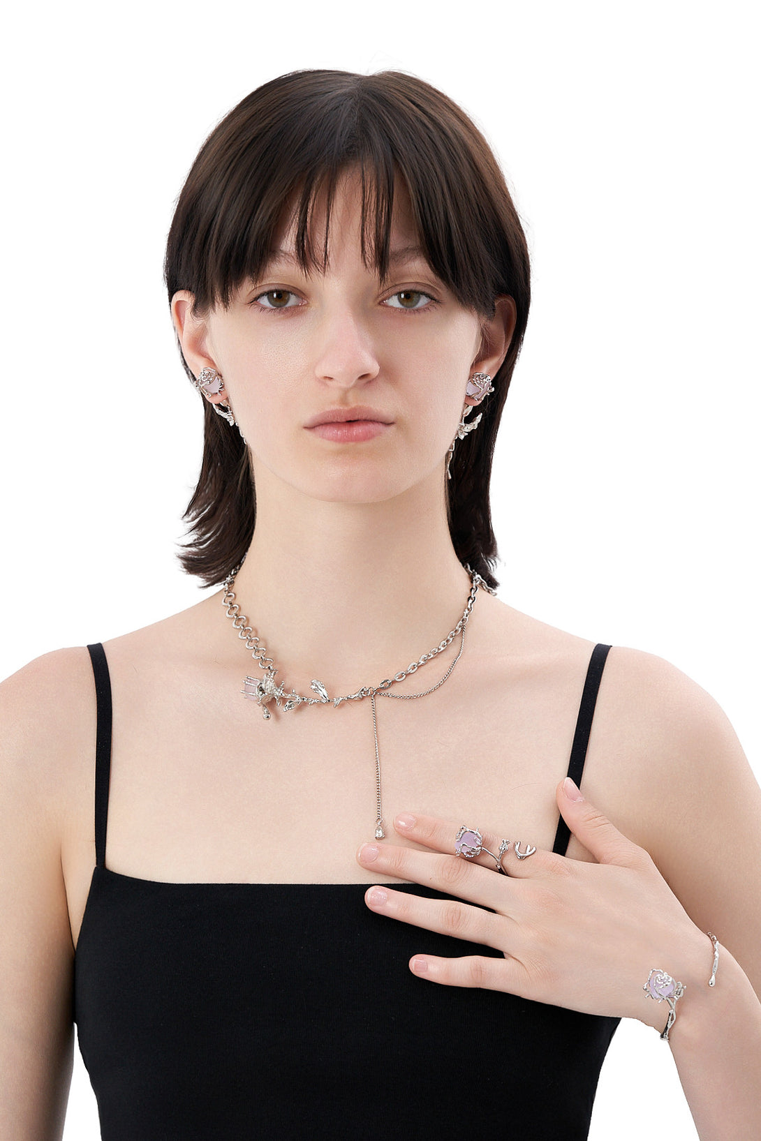 - Striking silver-tone earrings featuring a transparent raw-cut lilac stone in sculpted rose head at the front and a sculpted thorned vine backing