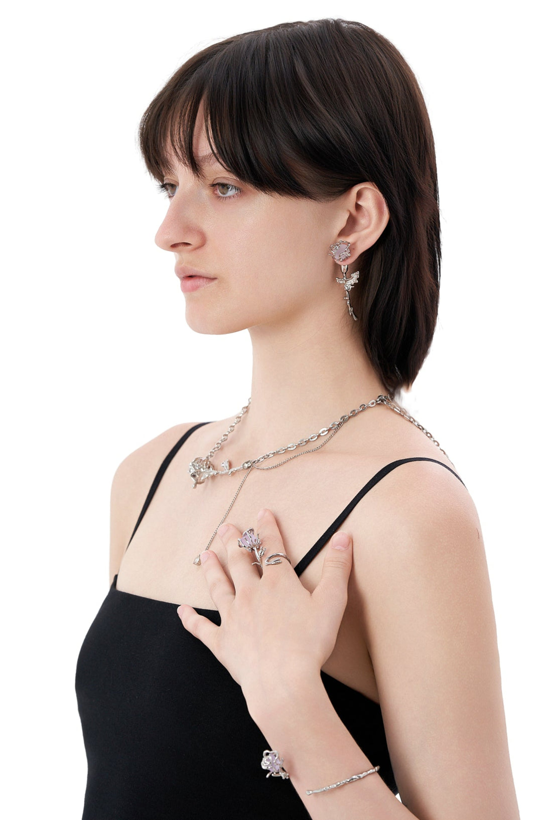 - Dual-chain design: one chunky chain connects seamlessly into the botanical centerpiece, while a slim drop chain with a single crystal accent extends for added movement